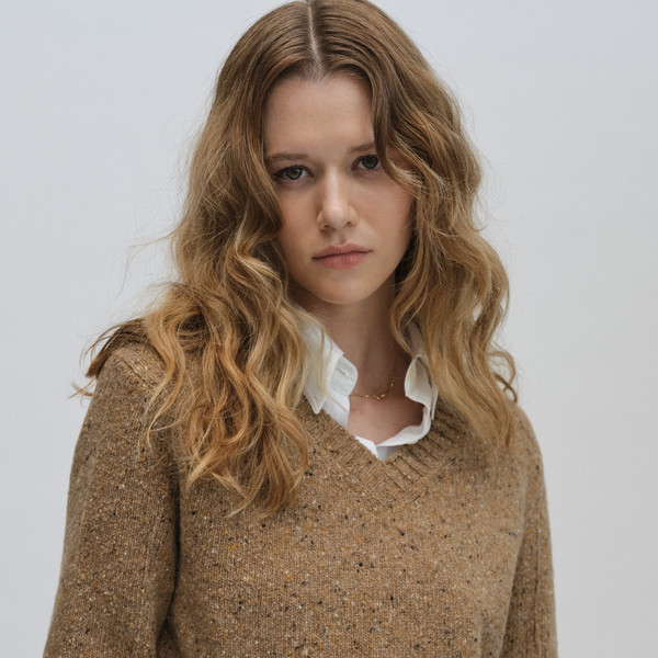 Color Mixed V Neck Sweater in Italian Yarn_Maple Brown